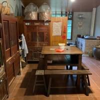 屋內擺設都是農村時代的真實記憶:紅磚大灶、老水缸、細竹編桌罩、老醋醰、方木餐桌及長椅條……旅人常說:「這裡像一本可以住進去的老故事書。」